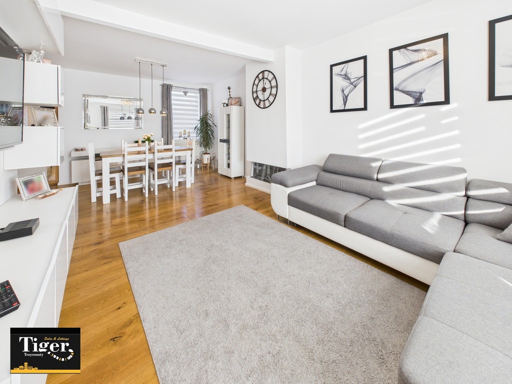 FULL DESCRIPTION This Show-Home-Standard two double bedroom end garden terrace house offers an exceptionally high standard of living accommodation with entrance hallway, large open plan lounge/dining room with quality flooring and leads onto a stunning fitted and integrated kitchen. There is a side door leading to a large garage which could offer more potential for living accommodation and in turn this leads into the rear lawn garden with sheltered decking area for entertaining. Upstairs are two double bedrooms and a luxurious 4-piece bathroom with free standing bath, stylish floor to ceiling tiles and a shower cubicle. One of the best two bedroom properties on the market!