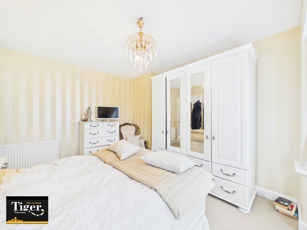 To the first floor, there are four well-proportioned bedrooms, all offering comfortable living space. The master bedroom benefits from fitted furniture, providing excellent storage solutions. The accommodation is served by a stylish three-piece family bathroom suite.