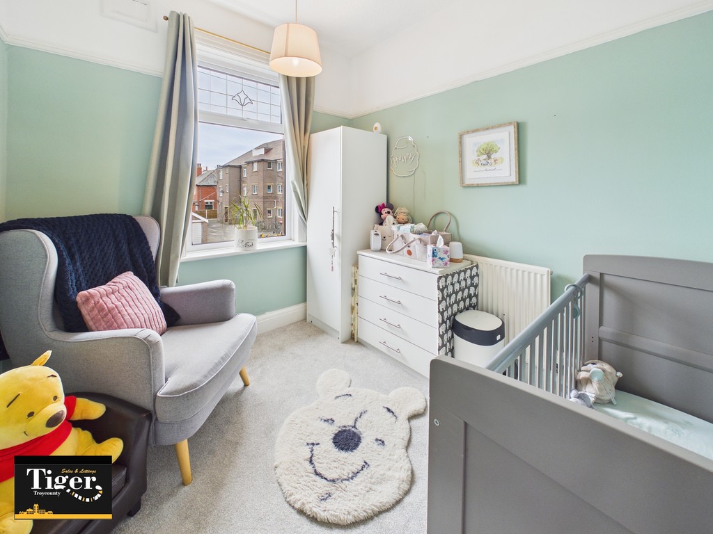 Upstairs, the first floor comprises three well-proportioned bedrooms. The main bedroom overlooks the front elevation and includes carpet flooring, fitted wardrobes and curtains. The second bedroom enjoys views over the rear garden and also benefits from carpet flooring and curtains. The third bedroom is positioned to the front and includes carpet flooring and a fitted blind, making it suitable as a bedroom, nursery or home office.